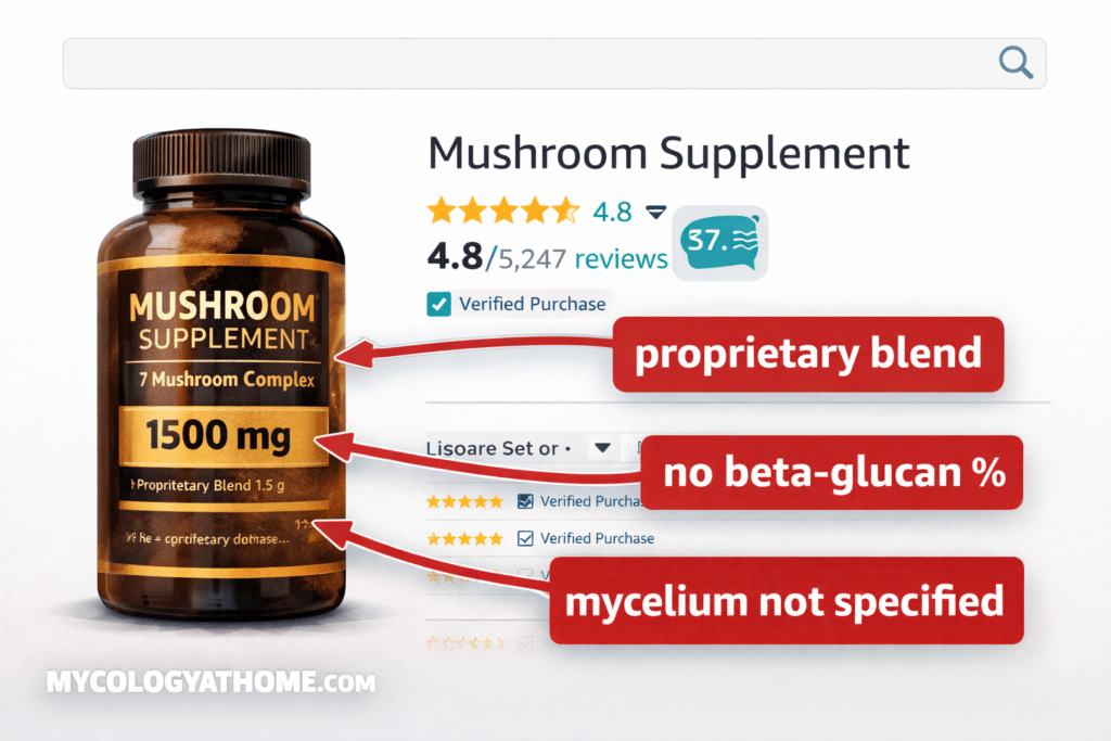 The information that matters, beta-glucan percentage, extraction method, fruiting body versus mycelium on grain, third-party testing, is not on the review page. Once you know where to find it, the star rating becomes the least interesting thing on the product listing.