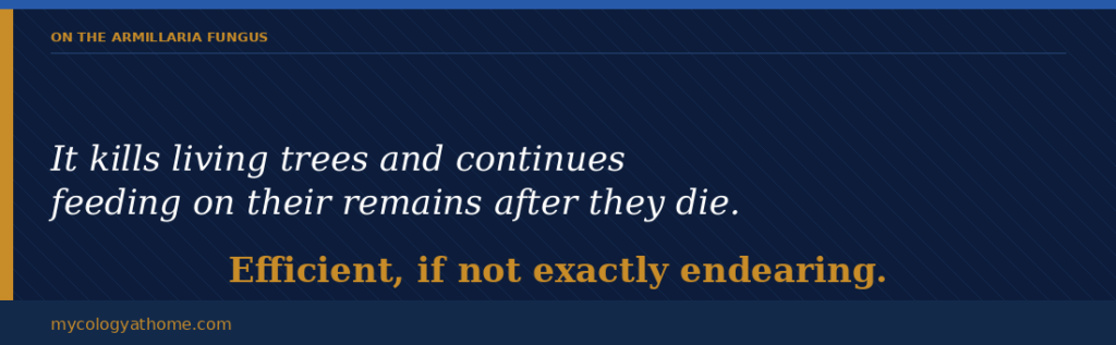 It feeds by colonizing the root systems and lower trunks of trees, breaking down the wood tissue and extracting nutrients. This makes it a parasite and a decomposer simultaneously. It kills living trees and then continues feeding on their remains after they die. Efficient, if not exactly endearing.